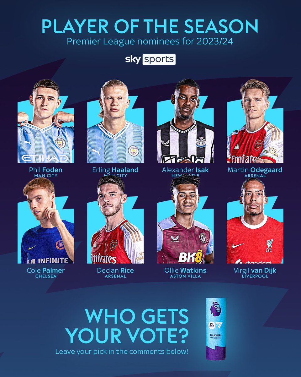 Phil Foden (City), Erling Haaland (City), Alexander Isak (Newcastle), Martin Odegaard (Arsenal), Cole Palmer (Chelsea), Declan Rice (Arsenal),  Olie Watkins (Aston Villa) e Virgil van Dijk (Liverpool) são os candidatos a melhor jogador do Ano na Premier League. Foden, Haaland, Isak e Palmer concorrem ainda para o prémio de melhor jovem, com Kobbie Mainoo (Man Utd), Saka (Arsenal), Saliba (Arsenal) e Udogie (Tottenham).
