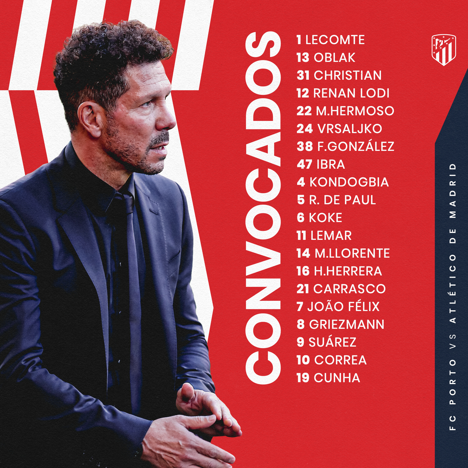 Os jovens Fran González e Ibra integram a convocatória do Atlético para o jogo no Dragão contra o FC Porto, referente à última jornada da Champions. Os dois centrais foram chamados para preencher as vagas dos ausentes Giménez, Savic e Felipe. Trippier é a outra baixa sonante no conjunto de Simeone.