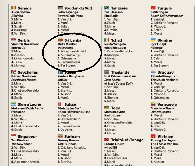 Hafiz Marikar, do ‘Daily News’ foi o escolhido pela ‘France Football’ para representar o Sri Lanka nos votos para a Bola de Ouro. E o jornalista, que no ano passado tinha metido Bonucci no 1.º lugar, voltou a surpreender ao considerar Alexander-Arnold como o melhor jogador do Mundo em 2019. Marikar colocou ainda Aubameyang em 2.º, e o apagado Griezmann em 3.º. Já Lewandowski e ter Stegen completaram o Top 5. Em Portugal quem votou foi Joaquim Rita, que deu o 1.º lugar a Ronaldo. Mané, Messi, Van Dijk e Bernardo Silva completaram o Top 5 do jornalista da SIC.