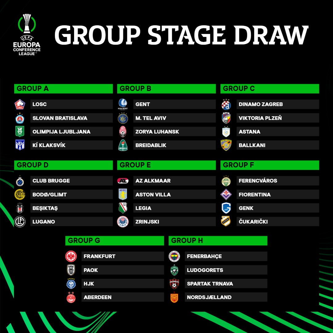 Já são conhecidos os grupos da Conference League. No A vamos ter o Lille de Paulo Fonseca e o Olimpija Ljubljana, de João Henriques. Slovan Bratislava e KÍ Klaksvík completam o grupo. Destaque ainda para o D que terá o Club Brugge, Bodo/Glimt, Besiktas e Lugano. O H com Fenerbahçe, Ludogorets, Spartak Trnava e Nordsjaelland também deve ser equilibrado.