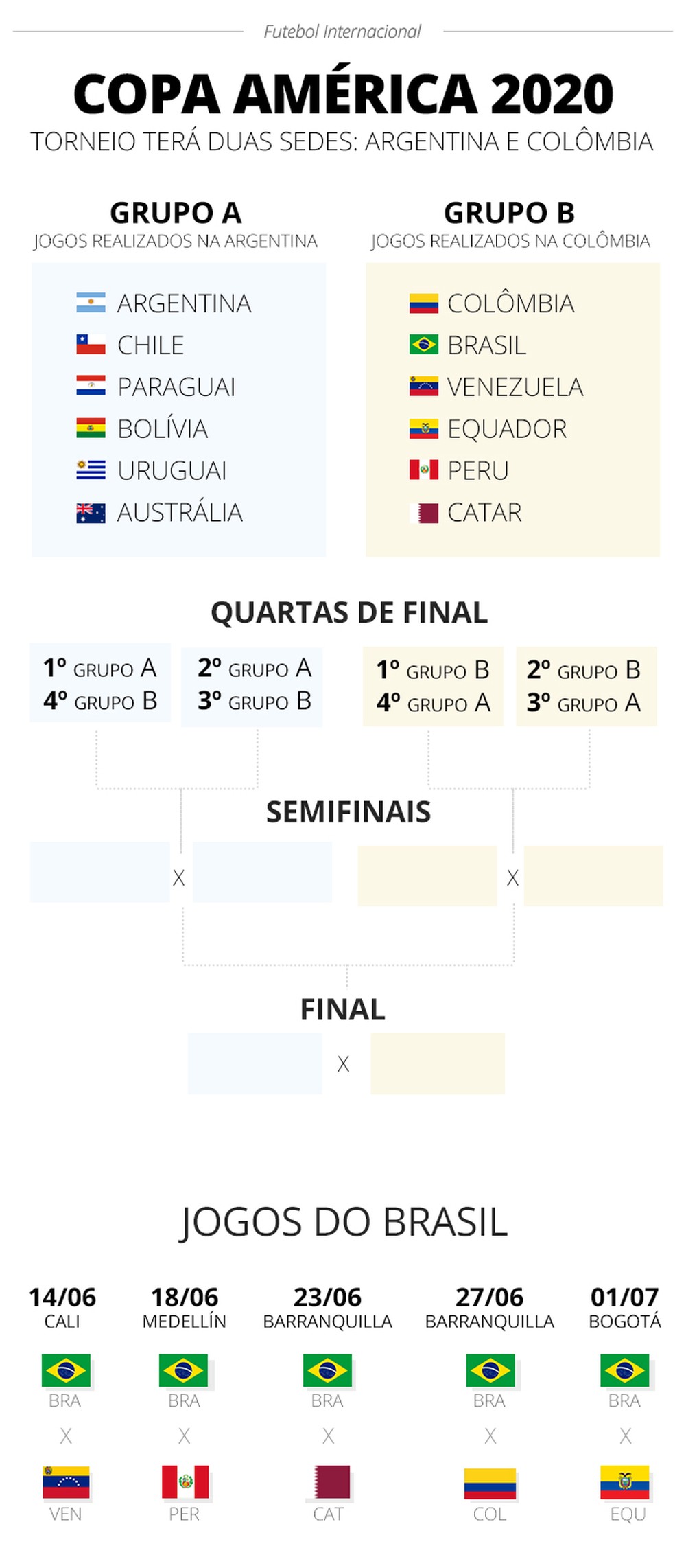 Já estão definidos os grupos da Copa América’2020, que se vai disputar na Argentina e Colômbia. O certame terá um novo formato, com apenas dois grupos, sendo que o grupo Sul conta com a anfitriã Argentina, o Uruguai, Chile, Paraguai, Bolívia e a convidada Austrália. Já no Norte ficaram a Colômbia,Brasil, Equador, Peru, Venezuela e o convidado Qatar. Recorde-se que passam os 4 primeiros de cada grupo.