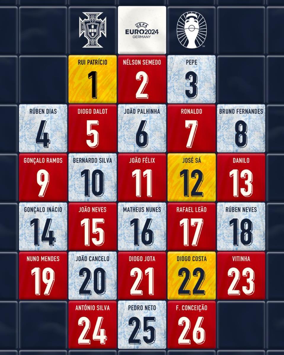 Já é conhecida a numeração das camisolas da Seleção portuguesa para o Euro’2024. E em relação ao Mundial’2022 há várias novidades. Gonçalo Ramos é agora o 9, Dalot o 5 e Nélson Semedo o 2. Já Patrício continua com a camisola n.º 1, enquanto Diogo Costa mantém o 22.