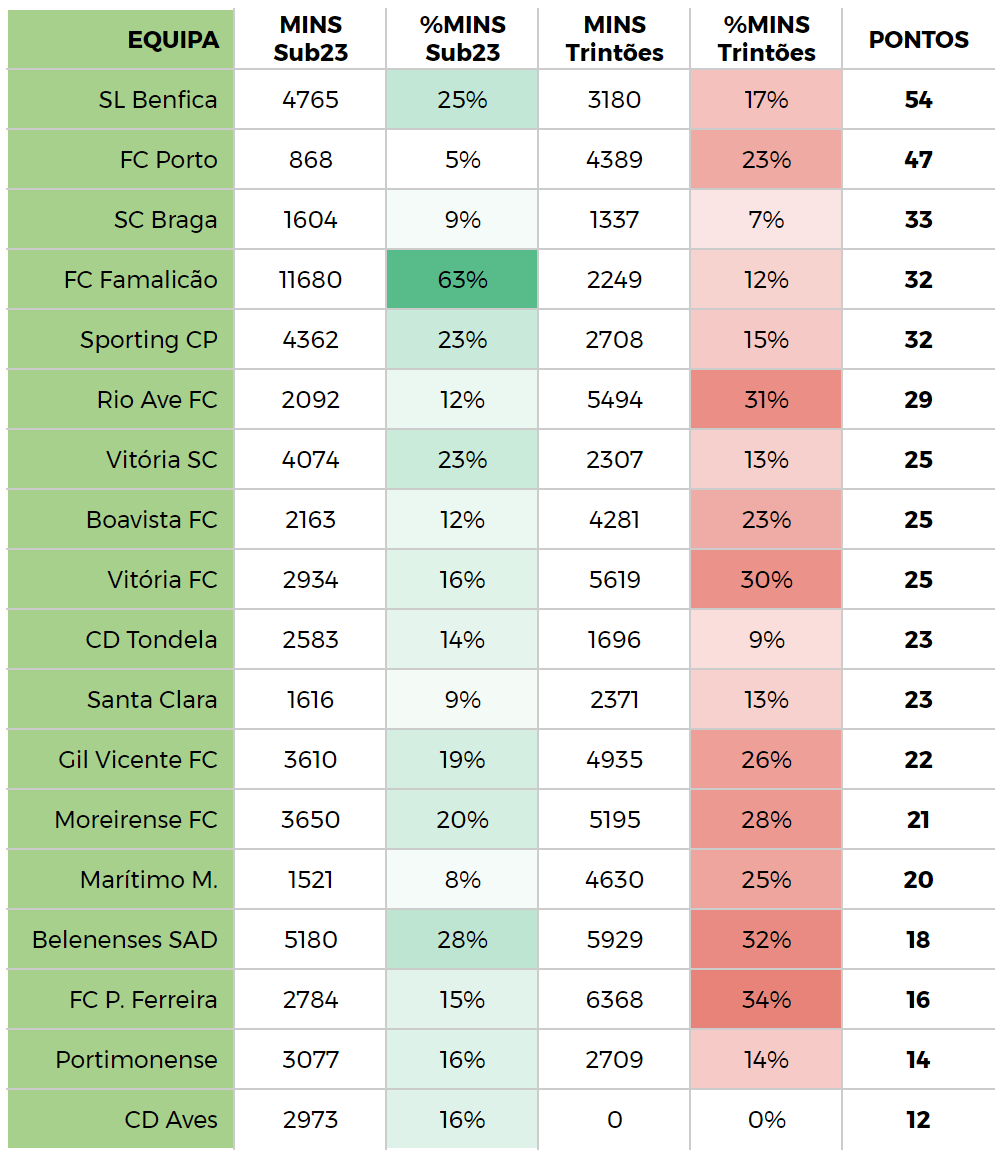 A I Liga tem sido palco para a valorização de vários activos em tenra idade nas últimas décadas e esta temporada não é excepção. São vários os jovens que têm dado nas vistas em Portugal, tanto nas equipas grandes como nas restantes, sendo que fica desde logo na retina a curiosidade em torno do D. Aves, que ainda não utilizou jogadores com idade superior a 30 anos e que na última jornada utilizou sete elementos abaixo dos 24 anos. Ainda assim, o clube que mais tem contribuído para uma média de idades mais baixa é o Famalicão, que tem uma percentagem de 63% de utilização de jogadores sub-23, seguido de Belenenses SAD (28%) e Benfica (25%). A juventude não é, por isso, sinónimo de insucesso, sobretudo se tiver qualidade, como comprova o líder destacado do campeonato. Em sentido inverso situa-se o FC Porto (5%), que segue uma estratégia totalmente distinta, apostando maioritariamente em jogadores acima dos 23 anos. Já o Paços de Ferreira é o clube com a maior percentagem de trintões (34%), seguido de Belenenses SAD (32%), Rio Ave (31%) e Vitória FC (30%).