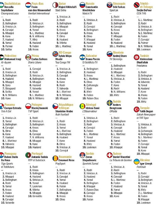 Votação piada, deveria ser notícia aqui do jornalista polaco a preferir o Rodri por ter curso superior e pela postura em campo. Que postura? De ser suspenso por proferir cânticos preconceituosos à seleção de Gilbratar ou a de apertar o pescoço aos adversários? Como que o Tadeia coloca o Halaand ou Kroos à frente do brasileiro? Ou do jornalista finlandês que o deixou fora dos 10 melhores? kkkk