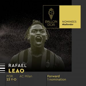 Os portugueses Rafael Leão, Cristiano Ronaldo, João Cancelo e Bernardo Silva integram os 30 nomeados à Bola de Ouro. Ambos campeões pelos seus clubes, os internacionais portugueses juntam-se a Karim Benzema, Haaland, Mbappé, Vlahovic, Van Dijk, Mahrez, Casemiro, Heung-min Son, Mohamed Salah, Modric, Rüdiger, Joshua Kimmich, Fabinho, Sadio Mané, Kevin de Bruyne, Haller, Phil Foden, Harry Kane, Mike Maignan, Courtois, Nkunku, Lewandowski, Vinícius Jr. ou Trent Alexander-Arnold. O ex-FC Porto Luis Díaz e o ex-Benfica Darwin Núñez completam lista. Já Lionel Messi ficou de fora, tal como Neymar, Hakimi, Thomas Muller ou Immobile.