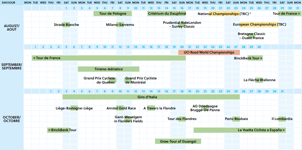 Vão ser três meses intensos, principalmente Outubro será um mês de loucos, mas desde que haja competição. Veremos é quais serão as escolhas dos ciclistas, é que este calendário por exemplo impede que Sagan opte pelo Giro, como inicialmente tinha previsto, e também pode tirar muitos trepadores da Vuelta, devido à Lombardia.