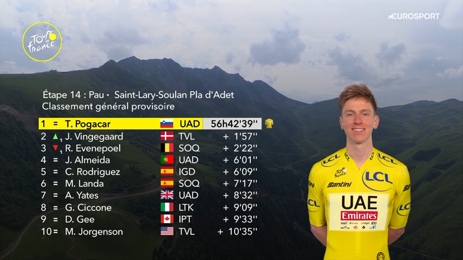 Tadej Pogacar cilindrou a concorrência ao vencer a etapa 14 com muita margem. O esloveno atacou a 4,6 km da meta, aproveitou que Adam Yates estava na frente e depois foi conseguindo aumenta a vantagem, chegando à meta com menos 39 segundos que Vingegaard e 1’10” que Evenepoel. Já Almeida chegou em 12.º, tendo perdido alguns segundos para Rodríguez e Landa. Na geral, Pogacar tem agora menos 1’57” que Vingegaard e 2’22” que Remco. Almeida é 4.º a 6’01”.