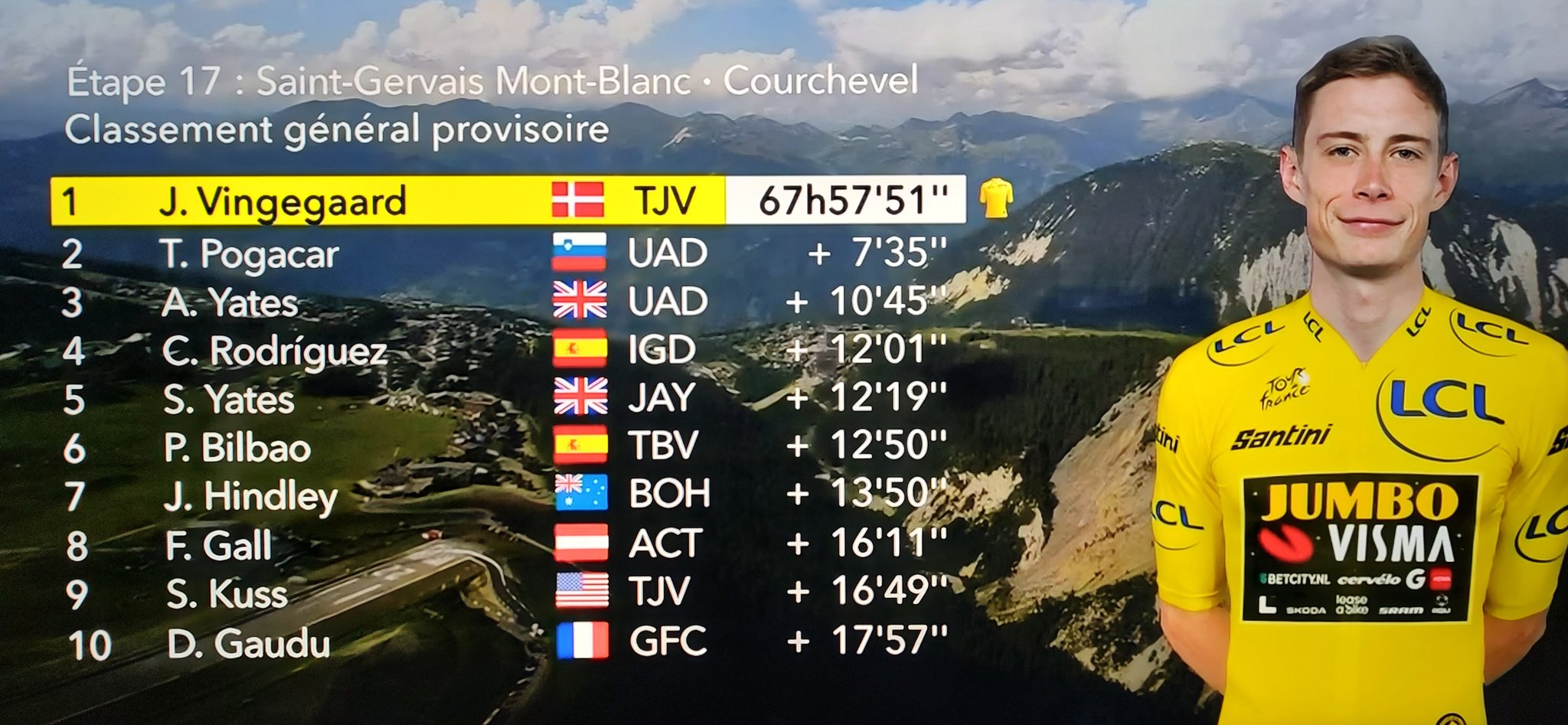 Quanto às acusações/suspeitas de doping, hoje então não têm sentido nenhum, o Vingegaard uma subida assim tão demolidora (já se sabia que para lá de Pogacar era muito melhor que todos os outros), veja-se que a diferença para o Adam Yates foi a habitual. O Pogacar é que teve um dia péssimo e a Jumbo talvez pressentido isso manteve a corrida a um ritmo elevado desde o início e ainda colocou dois homens na fuga que foram uma bela ajuda no final.