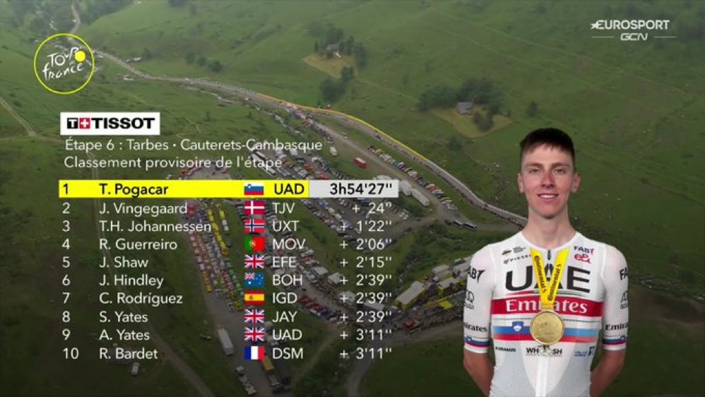 Comentei aqui ontem que Pogacar esta claramente a ganhar ritmo porque vem de uma lesão e que ainda ia ganhar o Tour e que era o favorito e já hoje deu uma resposta hoje, provando que tinha razão, claramente nunca se pode descartar o melhor ciclista do mundo ainda para mais quando se vê que está a ganhar ritmo aos poucos.