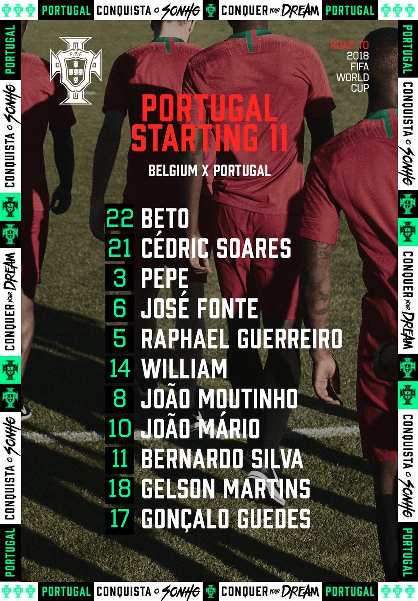 Fernando Santos vai alinhar frente à Bélgica com: Beto; Cédric, Pepe, José Fonte, Guerreiro; William Carvalho, João Moutinho, Bernardo Silva, João Mário; Gelson Martins e Gonçalo Guedes. Em relação ao jogo com a Tunísia, destaque para as presenças de Beto, Cédric, Moutinho, Fonte, Gelson e Guedes, que deverá funcionar como referência ofensiva. Já os Diabos Vermelhos fazem iniciar: Courtois, Alderweireld, Kompany, Vertonghen, Meunier, Mousa Dembélé, De Bruyne, Carrasco, Mertens, Eden Hazard e Lukaku.