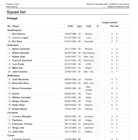 Renato Sanches e Domingos Duarte não integram a lista de 23 de Portugal para o embate contra a França, referente à penúltima jornada da Liga das Nações.