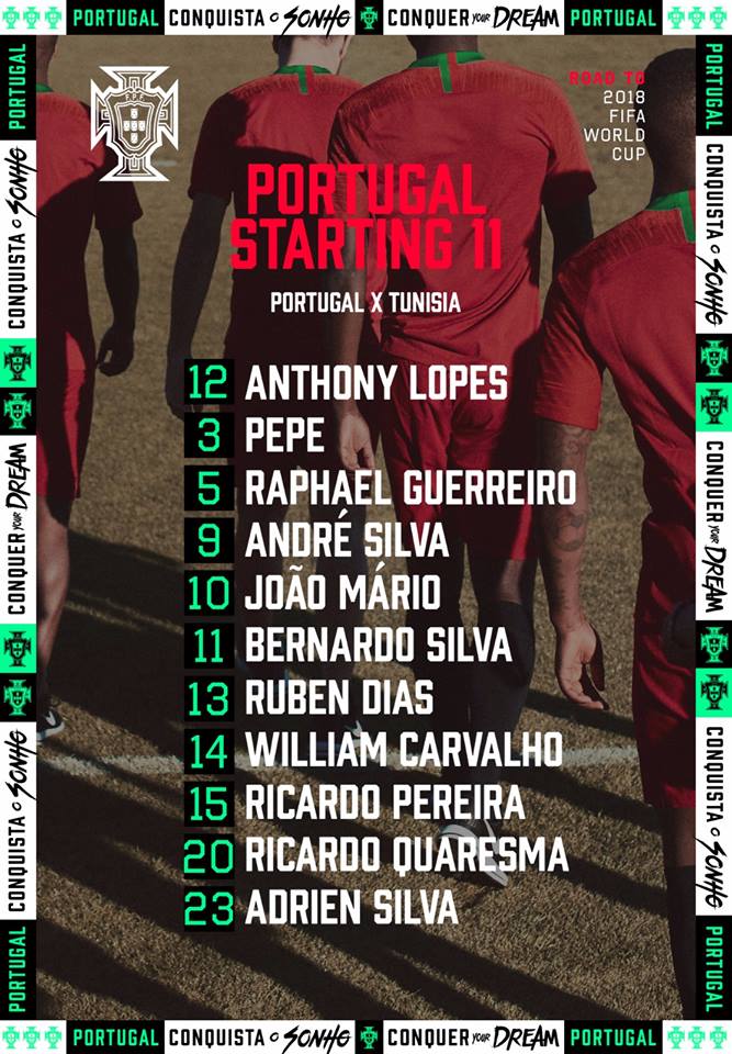 Fernando Santos vai alinhar frente à Tunísia com: Anthony Lopes, Ricardo, Pepe, Ruben Dias, Guerreiro; William Carvalho; Bernardo Silva, Adrien, João Mário; Quaresma e André Silva. Destaque para Rúben Dias, que faz a estreia pela equipa AA de Portugal. Já Ricardo e Adrien, pelo menos neste primeiro teste antes do Mundial, começam à frente de Cédric e Moutinho. A Tunísia começa com: Hassen; Nagguez, Benalouane, Meriah, Haddadi; Skhiri, Sassi; Badri, Khaoui, Sliti; Khalifa.