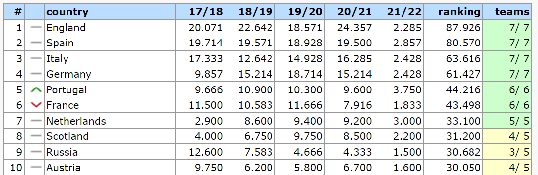 A prestação europeia portuguesa até ao momento tem sido irrepreensível (10 vitórias em 12 jogos, sendo uma delas contra o Tottenham). Acredito que possamos passar a França no próximo ano devido à perda de pontos de 16/17, mas havendo uma grande hipótese do PSG ir longe vai depender muito das prestações francesas na liga Europa. No entanto acho que este ano vai ser muito bom em termos europeus para os portugueses porque parecem estar muito sólidos e consistentes. O Braga está mais fraco mas deve passar os grupos da Liga Europa (esperemos que em primeiro para não ter de defrontar um terceiro da Champions), já os 3 grandes acredito piamente que dependendo do sorteio possamos ter duas equipas nos oitavos (se a Benfica ou Porto calhar Villarreal ou Lille e não calhar Milan no pote 4 e ao Sporting não calhar Milan ou Leipzig/Atalanta).