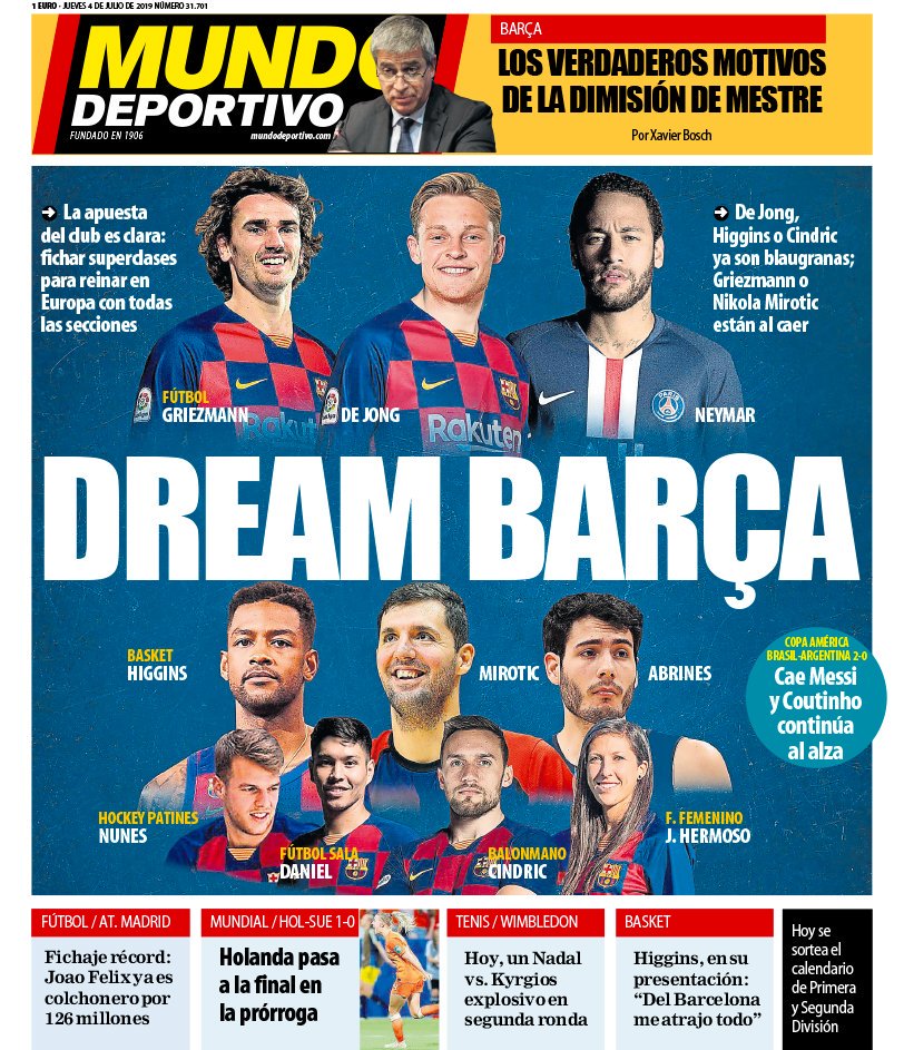 O Mundo Deportivo dá hoje destaque à ambição do Barcelona em dominar todas as modalidades esta época a nível interno e europeu. A publicação menciona a contratação do português Hélder Nunes (ex-FC Porto) para a equipa de Hóquei em Patins, de Daniel para o Futsal e a ideia de juntar Griezmann e Neymar (ambos para o futebol) ou Mirotic (para o basquetebol) numa espécie de ‘Dream Barça’. Recorde-se que os catalães já garantiram a aquisição de Frenkie de Jong para o futebol, Higgins para o basquetebol, Jenni Hermoso para a equipa de futebol feminino e Luka Cindric (um dos melhores jogadores do Mundo) para o Andebol.