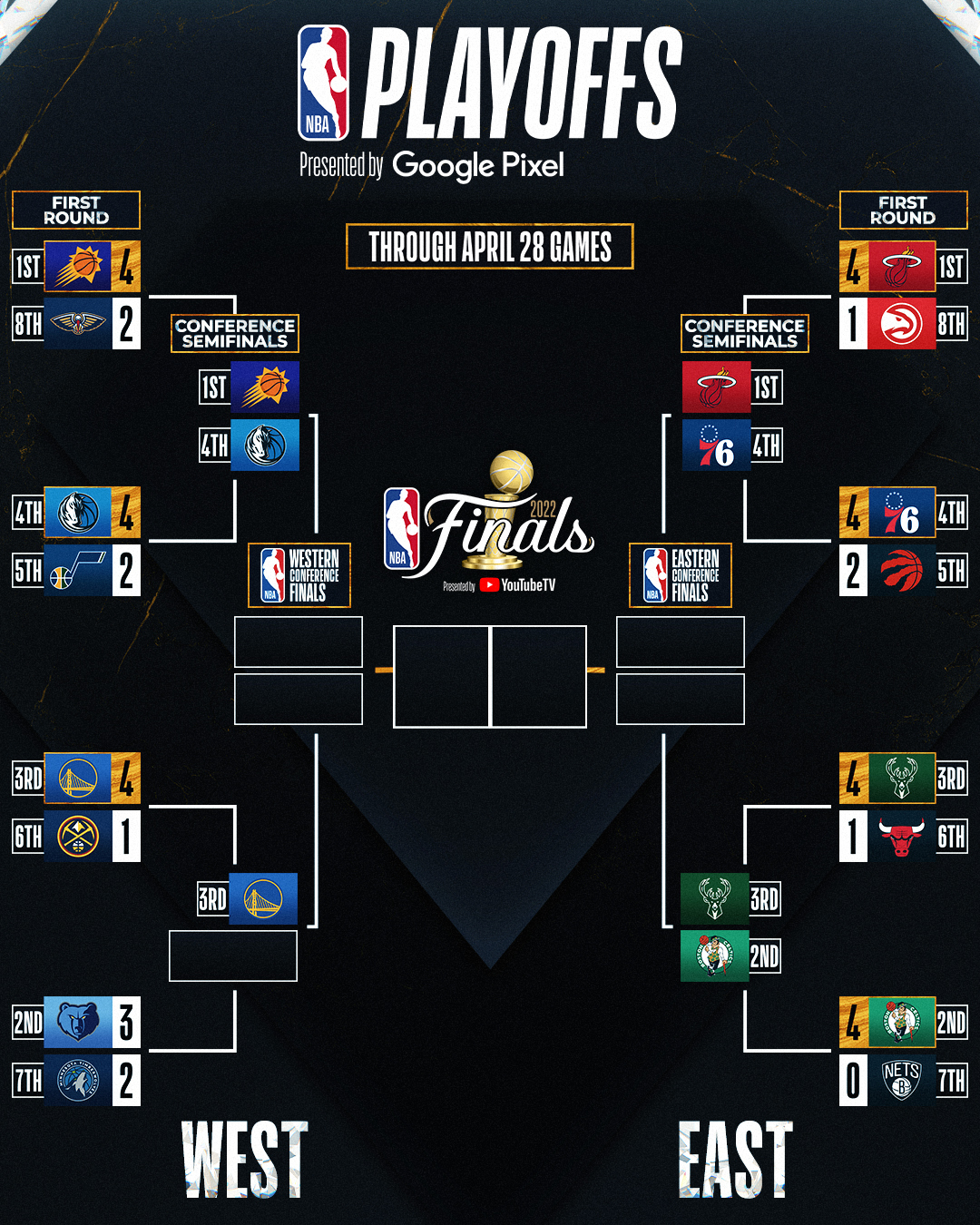 Três jogos na noite da NBA, três equipas que se apuraram para as meias-finais de Conferência. Os 76ers foram a Toronto vencer por 132-97 e marcaram duelo com os Heat. Embiid juntou 33 pontos a 10 ressaltos, Harden amealhou 22 e 15 assistências, enquanto Maxey marcou 25. Já os Suns, no regresso de Booker, bateram os Pelicans por 115-109 e marcaram confronto com os Mavs, que derrotaram os Jazz, por 98-96. Chris Paul teve um jogo perfeito com 33 pontos (14-14 nos lançamentos). Já em Utah um erro de Conley a 5 segundos do fim e a seguir um triplo desperdiçado por Bodganovic permitiram a Dallas passar a 1.ª ronda pela 1.ª vez desde 2011.