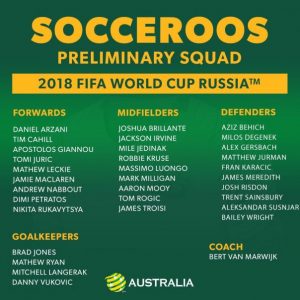 A Austrália anunciou a pré-convocatória para o Mundial’2018. O veterano Tim Cahill, de 38 anos, integra a lista de 32 jogadores, mas Bert van Marwijk não garante a presença do avançado no elenco final. “Cahill é um caso especial. É possivelmente um dos melhores jogadores na história da Austrália, mas tenho de fazer escolhas. É por isso que estou aqui e não tenho medo disso”, afirmou o seleccionador dos Socceroos. Pré-convocatória da Austrália para o Mundial’2018: Guarda-redes: Mathew Ryan (Brighton/Ing), Danny Vukovic (Genk/Bel), Brad Jones (Feyenoord/Hol) e Mitch Langerak (Nagoya Grampus/Jap); Defesas: Aziz Behich (Bursaspor/Tur), Milos Degenek (Yokohama F. Marinos/Jap), Matthew Jurman (Suwon Bluewings/Cor), James Meredith (Millwall/Ing), Josh Risdon (Western Sydney Wanderers), Trent Sainsbury (Grasshoppers/Sui), Aleksandar Susnjar (Mlada Boleslav/Che), Bailey Wright (Bristol City/Ing), Alex Gersbach (Lens/Fra) e Fran Karacic (Lokomotiv Zagreb/Cro); Médios: Josh Brillante (Sydney FC), Mile Jedinak (Aston Villa/Ing), Mark Milligan (Al Ahli/Ksa), Robbie Kruse (Bochum/Ale), Jackson Irvine (Hull City/Ing), Massimo Luongo (Queens Park Rangers/Ing), Aaron Mooy (Huddersfield/Ing), Tom Rogic (Celtic/Esc) e James Troisi (Melbourne Victory); Avançados: Tim Cahill (Millwall/Ing), Tomi Juric (Lucerna/Sui), Matthew Leckie (Hertha Berlim/Ale), Andrew Nabbout (Urawa Red Diamonds/Jap), Nikita Rukavytsya (Maccabi Haifa/Isr), Dimitri Petratos (Newcastle Jets), Jamie Maclaren (Hibernian/Esc), Daniel Arzani (Melbourne City) e Apostolos Giannou (AEK Larnaca/Chp).