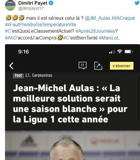Jean Michel-Aulas, defendeu a hipótese de «época em branco» na Ligue 1, caso não seja possível terminar a época 19-20. «O mais lógico seria dizer que cancelamos tudo e começamos novamente do início da temporada.. Ou, em caso de impossibilidade de terminar a prova, esta ficar sem despromovidos, sem campeão e com os mesmos qualificados europeus do que a última época», disse Jean Michel-Aulas ao Le Monde. Ora, esta tomada de posição mereceu uma reação de Dimitri Payet nas redes sociais. «Mas isso é sério? Qual é a classificação atual? Ao fim de 28 jonadas? Boa tentativa», escreveu o craque do Marselha.