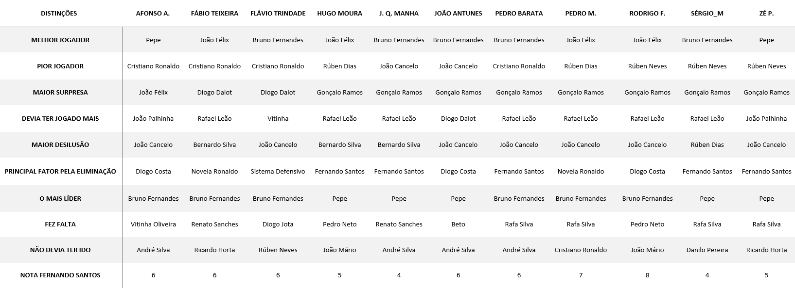 Cancelo ou Ronaldo para pior jogador, Dalot para surpresa, Leão para quem devia ter jogado mais, Renato para quem fez falta, André Silva para quem não devia ter ido.