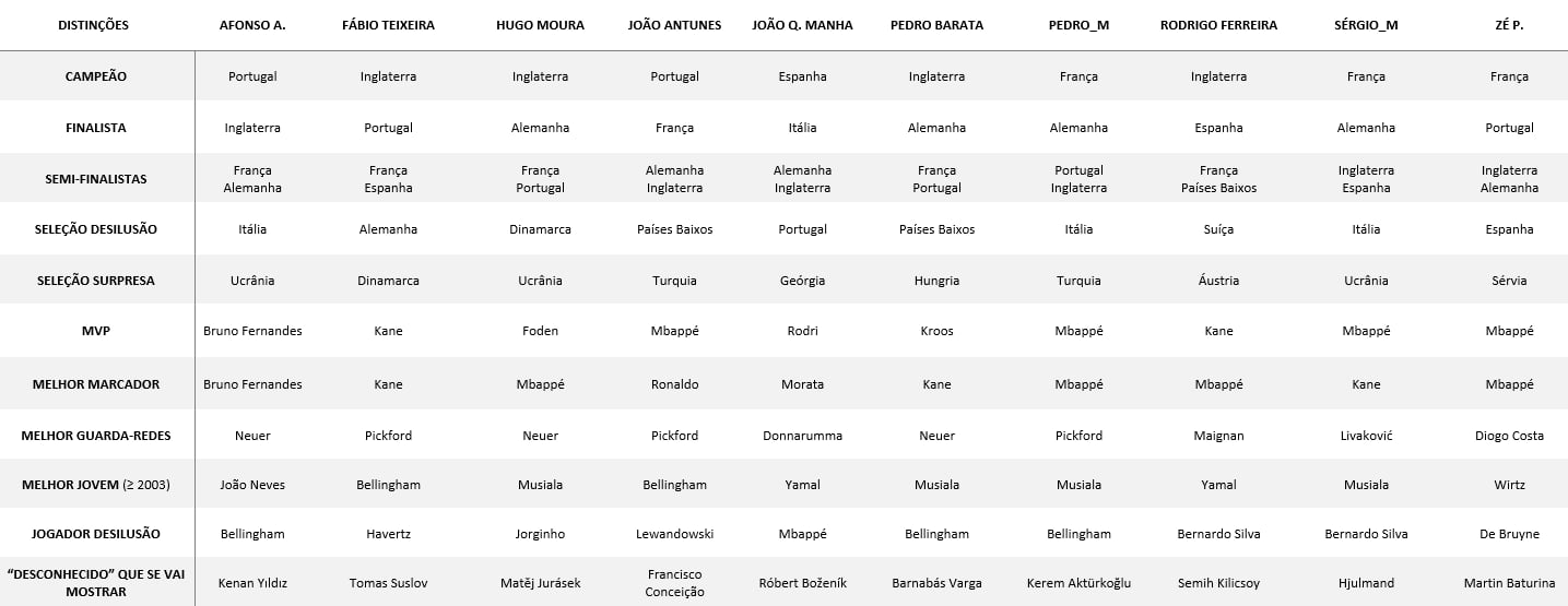 Vai começar o Euro’2024. Até 14 de Julho não deve faltar emoção e principalmente a imprevisibilidade que por norma marca este tipo de torneios. A Itália é atual campeã, mas está longe de ser favorita. Já a França parece partir na linha da frente, mas seguida de bem perto por Portugal, Alemanha, Espanha e Inglaterra. A nível individual a prova também promete ser recheada. Ronaldo vai participar pela 6.ª vez e ainda é um dos nomes maiores, mas temos Mbappé, Bellingham, Foden, Wirtz, Musiala, Kane, a despedida de Kroos ou o ainda sub-17 Lamine Yamal. Com isto tudo, os colaboradores arriscaram um prognóstico, tendo a Inglaterra reunido a preferência. Já a Alemanha foi a mais escolhida para chegar à final, enquanto Portugal (que tem um caminho muito fácil até às meias-finais) e França devem completar o Top 4. Já Mbappé foi o mais votado para MVP e melhor marcador, enquanto Jude Bellingham teve mais votos na desilusão.
