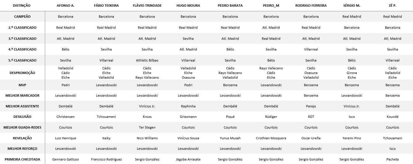 A La Liga está de volta e a edição deste ano está particularmente recheada. O Barcelona montou uma super-equipa, com as contratações de Koundé, Kessié, Raphinha, Christensen e principalmente Lewandowski, e parece ter todas as condições para regressar ao patamar que habituou o mundo do futebol. No entanto terá pela frente um Real Madrid, que é só atual campeão espanhol e da Champions, e ainda aumentou a qualidade do plantel com as chegadas de Rudiger e Tchouaméni. Também o Atlético parte para esta época com legítimas ambições ao título. A equipa de Simeone dá-se bem quando tem menos protagonismo (em 2021-22 não aguentou o estatuto de favorita), tem a base que venceu o campeonato há 2 anos, e contratou Witsel ou Molina, que encaixam no que pede El Cholo. Não se pode igualmente ignorar o Sevilla. O conjunto de Lopetegui nos últimos 2 anos deu a ideia que podia ser campeão (depois acabou por descambar na 2.ª metade da temporada), e, apesar de ter perdido a dupla de centrais titulares, conta com um elenco cheio de qualidade técnica e variadíssimas soluções. Já Villarreal e Bétis parecem ser os principais candidatos à luta pelo 5.º lugar. Será igualmente interessante ver o que Valencia de Gattuso pode acrescentar. A Real Sociedad, com as aquisições de Mohamed-Ali Cho, Brais Méndez e Kudo, e pelo que tem apresentado nos últimos anos, é outra das equipas a seguir, tal como o rival Athletic, agora que Valverde regressou ao clube. Depois desta espécie de Top 10 parece haver um fosso, mas será surpreendente se Getafe e Celta não garantirem a permanência. O Osasuna também tem conseguido ‘levar a águia ao seu moinho’. Já Elche, Cádiz, Valladolid, Girona, Rayo Vallecano, Mallorca e Almeria, na teoria, vão andar a lutar pela manutenção. Com isto tudo, fica o prognóstico dos colaboradores do Visão de Mercado: