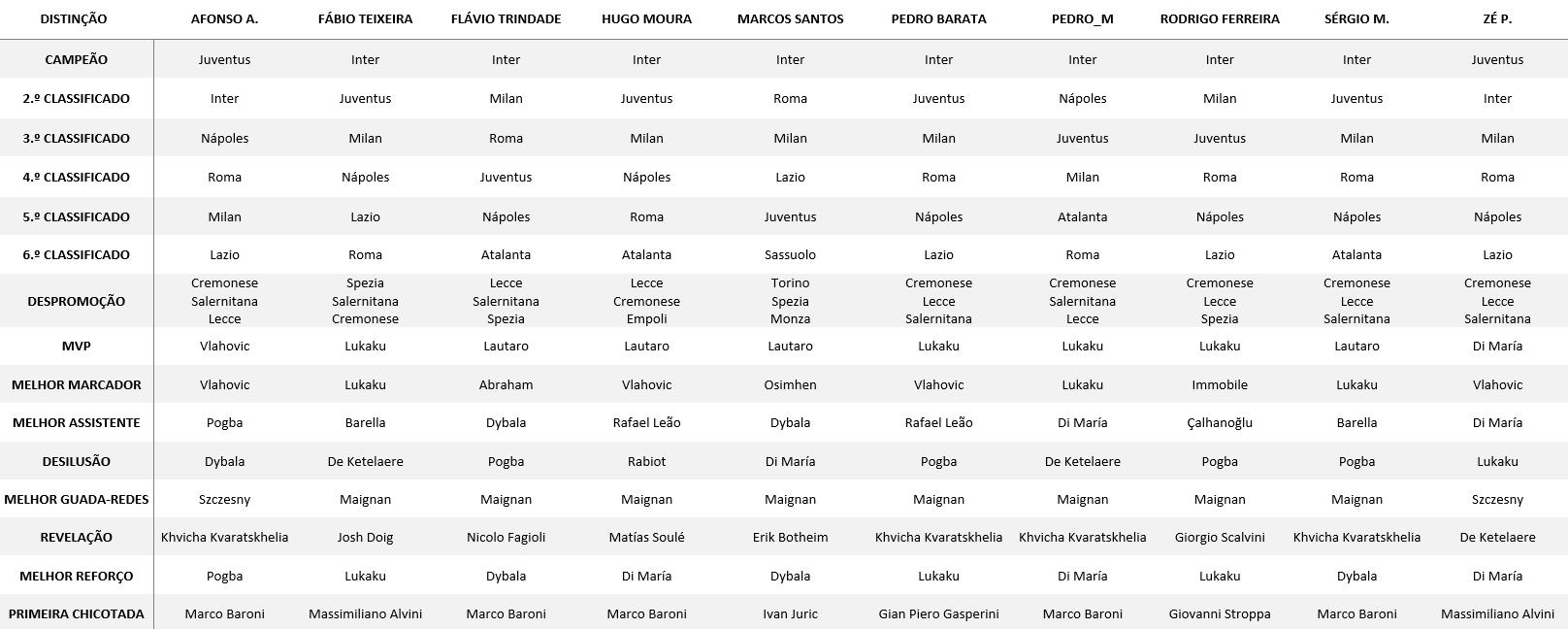 A minha previsão é Inter campeão, Roma consegue o quarto lugar e o Nápoles será a desilusão (6°/7°). Tenho para mim que Abraham será o melhor marcador o que lhe valerá um “retorno” ao Chelsea no final da época pela opção de recompra (creio que ainda existe e ser de 80M).