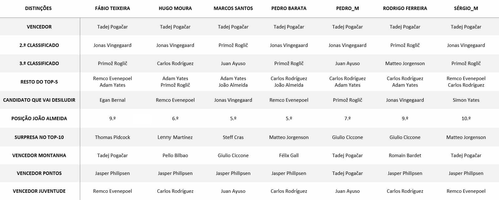 Eu sou muito cético em relação ao Giro Tour e portanto vou apenas apostar que o Pogacar não vence o Tour e que o Tour vai ser vencido pelo Roglic ou Vingegaard (porque é de longe o melhor na montanha e vai estar pelo menos a 90%) sendo que a luta pelo terceiro estará entre Pogacar e Carlos Rodriguez. O meu preferido é o Remco mas é ele que vai ter de provar que consegue lutar por isto antes de eu apostar nele novamente. Para o restante top 15 nem vale apena fazer prognósticos porque há imensos ciclistas com capacidade para tal.