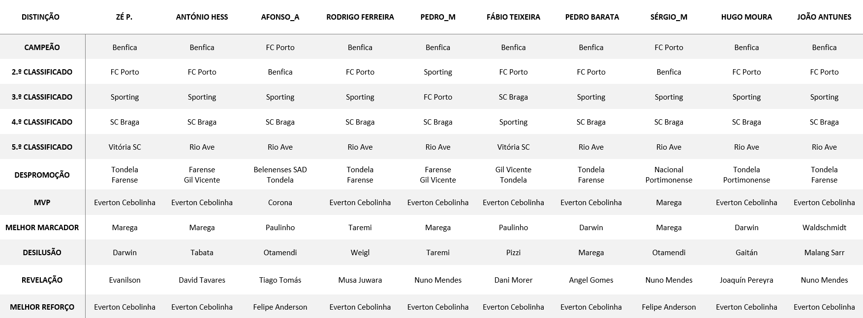 Angel Gomes ou Nuno Mendes a revelação, Cebolinha a MVP e melhor reforço, Paulinho melhor marcador, Gilberto maior desilusão (se bem que acho que já ninguém tem assim grandes expectativas no presente).