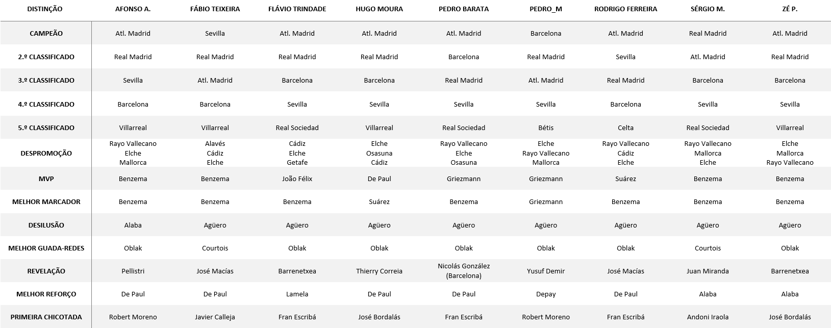 Aposto em Depay como o MVP da Liga. Já disse algumas vezes que este é um dos melhores jogadores do mundo, e há um ano levou o Lyon às meias da Champions (muito acima da realidade do clube). O Real para já parte como favorito, mas ainda há muitas dúvidas em como Rodrygo, Vinicius irão evoluir e se Bale voltará a brilhar com Ancelotti como ocorreu entre 2013-2015.