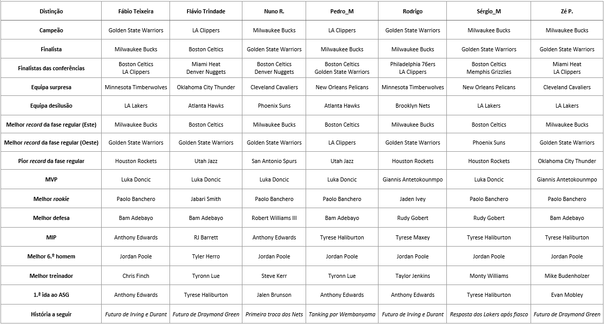 Vai começar uma das épocas mais esperadas na história da NBA. Há 7 equipas (Warriors, Nuggets, Clippers, Bucks, 76ers, Celtics e Nets) com reais possibilidades de chegar ao título, e outras, como os Mavs, Suns, Heat, Raptors, Wolves ou Grizzlies, que pela valia individual ou coletiva, podem surpreender. A nível individual também não faltam candidatos ao prémio de MVP, com Doncic, Curry, Giannis, Embiid e Ja Morant à cabeça. Com isto, os colaboradores do Visão de Mercado arriscaram um prognóstico, e Milwaukee foi a equipa mais escolhida para campeã. Já os Warriors reuniram algum consenso em relação a uma presença na final. Doncic, por sua vez, foi o mais votado para MVP, Banchero para Rookie do Ano e Tyrese Haliburton para MIP. Este ano promete ser também muito agitado fora dos pavilhões, sendo que Irving, Durant e Draymond Green devem proporcionar muitas novelas e rumores. Há ainda curiosidade para ver a postura de algumas equipas na tentativa de sacarem o fenómeno Victor Wembanyama.