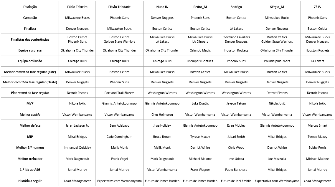 Começa hoje a temporada da NBA e novamente com 6-7 fortes candidatos ao Anel. Os Nuggets são os campeões, mas o Oeste está muito recheado e os Suns, com KD, Beal e Booker, os Lakers, de AD e LeBron, os Warriors, que juntaram CP3 a Klay, Green e Curry, os Clippers, de Paul George e Kawhi Leonard, e os Mavs, de Doncic e Irving querem ter uma palavra a dizer. E ainda há os Kings, que realizaram uma grande época, Grizzlies, Wolves ou Pelicans. Já no Este, parece ser uma corrida a dois. Os Celtics montaram um 5 fortíssimo, enquanto os Bucks juntaram Lillard a Giannis. Por fora, mas a uma distância que parece algo grande, correm os 76ers e os Heat, que nunca podem ser descartados. Esta época promete ser igualmente fascinante ao nível dos prémios individuais. A corrida ao título de MVP tem tudo para ser das mais animadas de sempre. Há ainda a curiosidade para ver se Wembanyama domina nos Rookies, e perceber quem será o MIP. Neste sentido, alguns dos colaboradores do Visão de Mercado arriscaram um prognóstico sobre o que irá acontecer em 2023-24, e este foi o resultado: