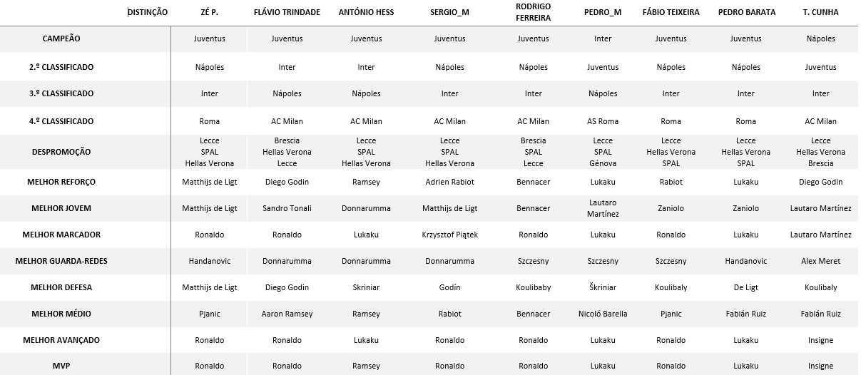 Juventus como campeão com maior ou menor dificuldade, Inter em 2º pelo factor Conte e com Lukaku em destaque como um dos melhores reforços da época e o Napoli em 3º com Paulo Fonseca a levar a Roma ao 4º lugar. Ronaldo será o melhor marcador do campeonato à 2ª tentativa e novamente o MVP. De Ligt como melhor jovem.