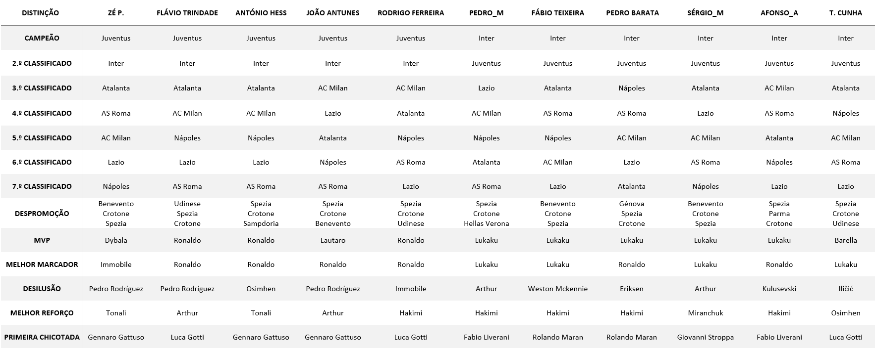 Creio que Juve será campeã, com margem muito confortável e com com futebol. Ser grande jogador não é garantia de ser bom treinador mas tenho feeling que Pirlo fará um grande trabalho. Milan demonstrou no final da época que pode fazer bonito e inter fez o inverso… Os clubes de Milão tornaram-se especialistas em dar tiros nos pés por isso são uma incógnita; a minha previsão para 2° recai sobre Inter (apesar disso) e Atalanta.