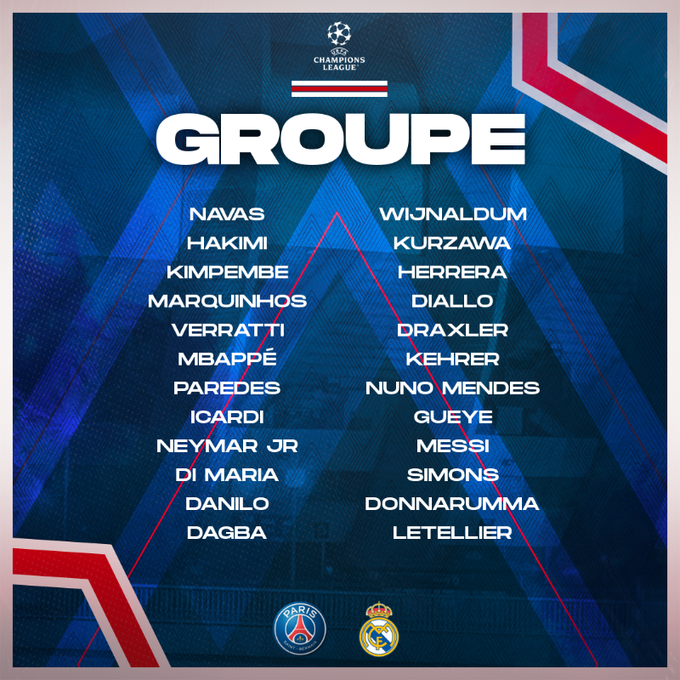Navas, Hakimi, Marquinhos, Kimpembe, Nuno Mendes, Danilo, Paredes, Verratti, Draxler, Mbappé, Messi. Colocaria Draxler por ser o extremo que melhor contribui a médio, e desta forma contrariar melhor a posse que o Real Madrid exerce com Kroos e Modric. Se jogar Benzema, colocaria Danilo sempre em cima dele, enquanto que Marquinhos e Kimpembe teriam de ter o cuidado de dobrar os laterais e ter em atenção os extremos do Real Madrid. Acredito que Pocchettino fará algo do género, talvez até surpreenda com Xavi Simons em vez de Draxler.