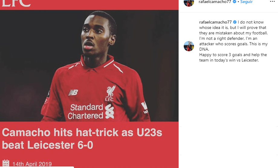 Rafael Camacho fez um hat-trick pela equipa de sub-23 do Liverpool frente ao Leicester e depois do jogo não poupou nas bocas no Instagram. “Não sei de quem foi a ideia, mas vou provar que estão errados sobre o meu futebol. Não sou um lateral direito. Sou um avançado que marca golos. Esse é o meu ADN. Feliz por ter apontado 3 golos e ajudado a equipa na vitória de hoje contra o Leicester”, escreveu o jovem de 18 anos que tem sido ao Sporting e Wolverhampton.