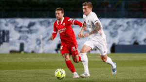 O Real Madrid não foi além do 2-2, em casa, diante do Sevilla, e já não depende de si para chegar ao título. Num jogo cheio de peripécias os andaluzes adiantaram-se pelo ex-FC Porto Fernando, tendo Asensio empatado aos 67′. No minuto 78′ deu-se um dos momentos que vai ser tema em Espanha durante toda a semana, com o árbitro a assinalar penálti sobre Benzema e o VAR a identificar uma penalidade de Militão do outro lado do campo. Aproveitou Rakitic para fazer o 2-1. Os blancos conseguiram reagir e chegaram ao empate já no minuto 94 por Hazard, que desviou um remate de Kroos. O Real segue assim em 2.º, com 75 pontos, os mesmos do Barcelona e menos 2 que o Atlético. Já o Sevilla que perdeu 5 pontos nas últimas duas jornadas, tem 71.