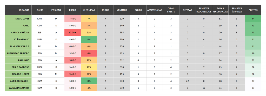 Com a viragem do ano, assistiram-se a algumas alterações na Liga, sendo que, além da recuperação do FC Porto em relação ao Benfica nas últimas semanas, também formações como o SC Braga, o Marítimo ou o Santa Clara deram um salto competitivo. Numa sequência interessante segue também o Rio Ave, que promete lutar até final pelo top-5. Já o Sporting ou o Vitória SC continuam intermitentes, enquanto o Famalicão quebrou, assim como o Tondela. Nesse sentido, tendo em conta a parceria VM e RealFevr importa olhar para aqueles que estão a ser, a nível individual, os nomes fortes nestas primeiras semanas de 2020. De trás para a frente o melhor XI é composto por: Amir (Marítimo); Nanu (Marítimo), Zainadine (Marítimo), Fábio Cardoso (Santa Clara), João Afonso (Santa Clara); Varela (Belenenses SAD), Diego Lopes (Rio Ave), Trincão (SC Braga), Ricardo Horta (SC Braga); Vinícius (Benfica), Paulinho (SC Braga). Como curiosidades importa destacar que este XI integra 3 elementos de Marítimo e SC Braga, 2 do Santa Clara, 1 do Benfica, 1 do Belenenses SAD e 1 do Rio Ave, bem como o facto de nenhum apostador contar com Varela e Amir nas suas equipas. Já Vinícius (21%), Ricardo Horta (20%) e Paulinho (19%) são muito requisitados.