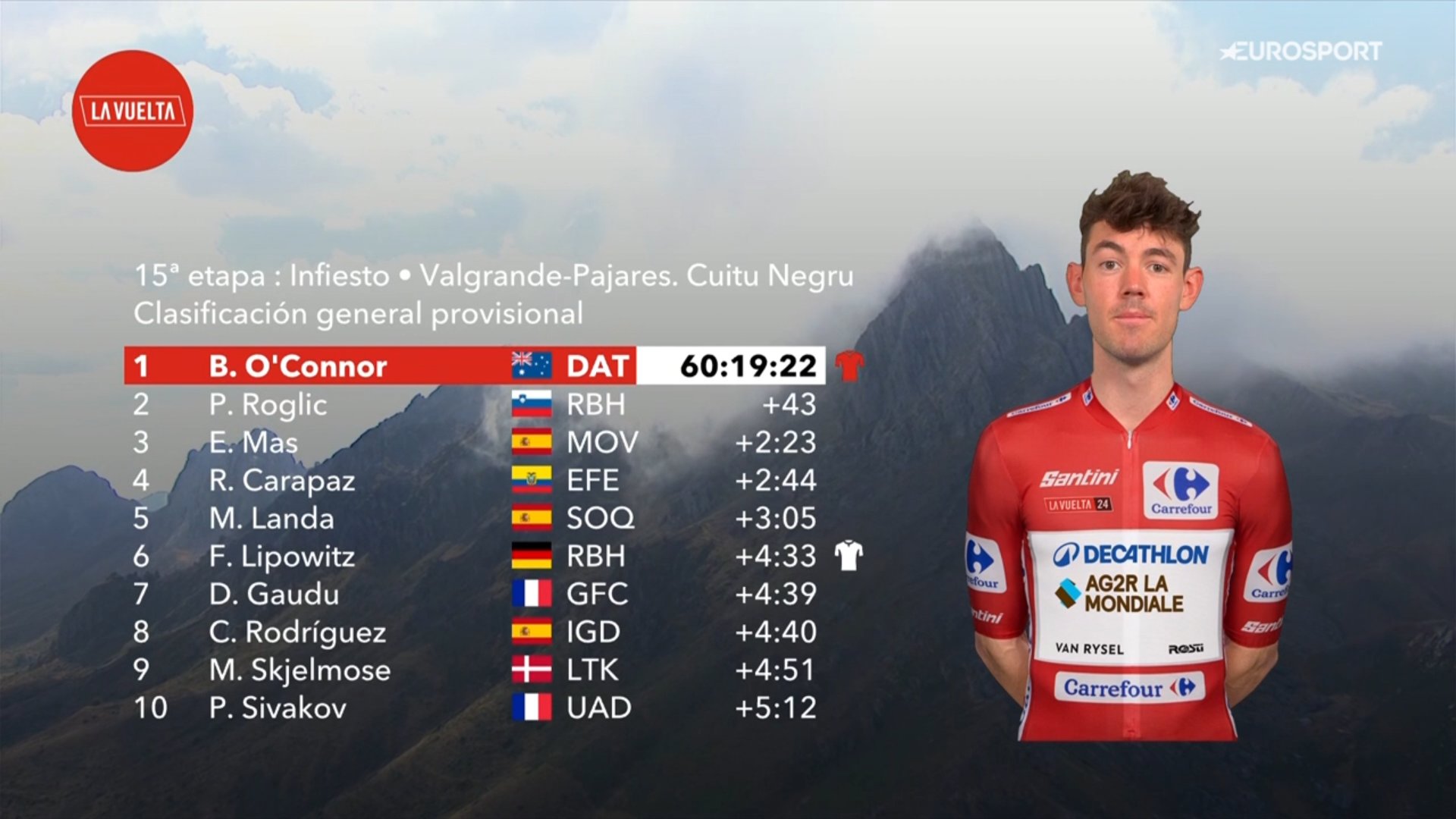 O surpreendente Pablo Castrillo bisou na Vuelta ao ser o mais forte no Valgrande-Pajares. Cuitu Negru. O espanhol destacou-se na última subida e ficou à frente de Vlasov. Já Enric Mas foi o mais forte dos favoritos, tendo terminado em 4.º com Roglic. Ben O’Connor, por sua vez, perdeu mais 39 segundos para Primoz e tem agora apenas 43 de vantagem.