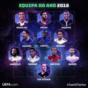 Cristiano Ronaldo figura pela 13.ª vez na equipa do Ano da UEFA. O português, que bateu o seu próprio recorde de jogador com mais presenças na história, tem a companhia de Ter Stegen (Barcelona), Ramos (Real Madrid) , Van Dijk (Liverpool), Varane (Real Madrid) e Marcelo (Real Madrid); Modric (Real Madrid), Kanté (Chelsea) e Hazard (Chelsea) Mbappé (PSG) e Messi (Barcelona). Luka Modric, do Real Madrid, foi o jogador mais votado pelos internautas (115.440 votos), depois surgiu Cristiano Ronaldo (108.423) e Messi (107.326).