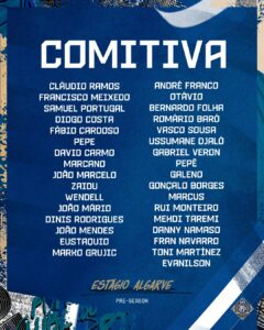 O FC Porto anunciou a comitiva que vai seguir para o estágio de pré-época no Algarve com algumas novidades à mistura. Sérgio Conceição optou por integrar 33 elementos, com vários jovens a terem a chance de se mostrarem à equipa técnica azul e branca, nomeadamente Dinis Rodrigues, João Mendes, Ussumane Djaló, Abraham Marcus ou Rui Monteiro. Também Romário Baró, de regresso após empréstimo, se apresenta na convocatória, bem como o único reforço até ao momento Fran Navarro.