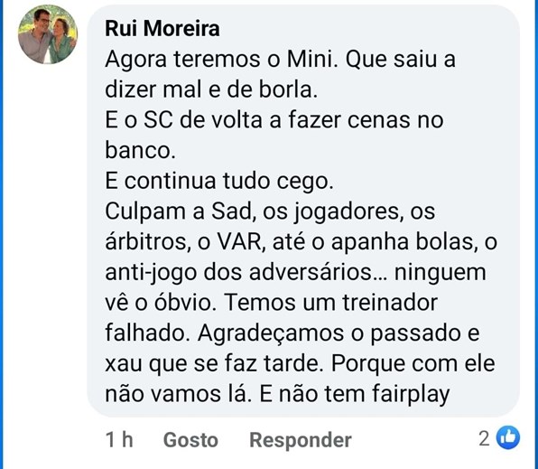 O Rui Moreira nunca será candidato à presidência do Porto, da mesma maneira que o SC será considerado para uma equipa com outros argumentos financeiros, porque apesar de o futebol português não ser visto lá fora, os agentes e demais sabem bem os comportamentos dos que por aqui andam, ao qual acresce que as equipas dele são fracas ao nível do jogo “jogado”, mesmo com jogadores diferenciados, e potencialmente de um perfil diferente ele procura sempre o mesmo(nem sei como Nico Gonzalez teve a sua aprovação, pq claramente foge ao perfil) …a direção e o clube estão falidos a todos os níveis, quer financeiramente, quer de identidade, e estão presas ao discurso bacoco e provinciano ! Acresce talvez ainda o maior perigo que é agradar aos SD e ao seu líder em especial que toda a gente sabe o que representa( até mestrado tem no ISMAE) é triste um rival forte e que tanto conquistou ter um discurso inferior e inútil, onde cada vez mais vozes se levantam contra a atual administração, porque finalmente começam a perder o medo, mas ele lá estará em 2024 a ser reeleito para mais um mandato! É mm dizer “Quou vadis FCP”!!!!