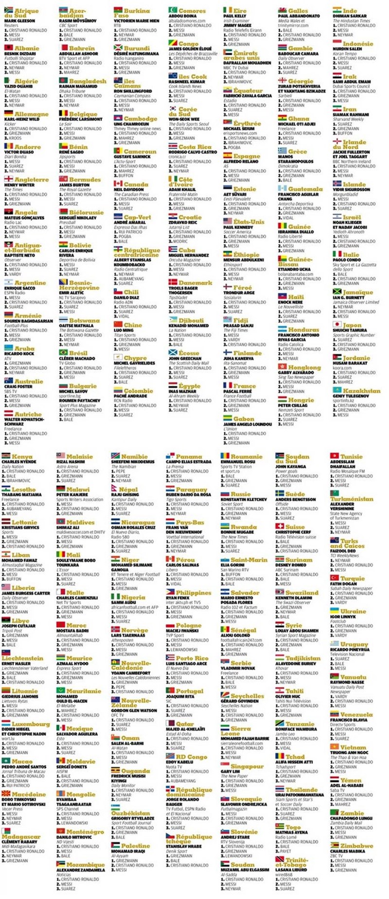Meter em causa o jornalismo por isto nao faz sentido, é um pouco falta de liberdade de expressão. Olha os votos do jornalista Italiano, nem Messi nem Ronaldo nem Griezmman em 1º.