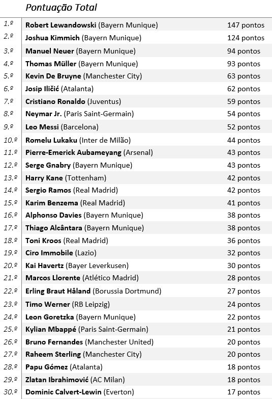 Desde que Ronaldo e Messi se erigiram como os melhores da sua geração, dividindo entre si a maioria dos galardões individuais, a “rivalidade” entre ambos transfigurou a forma como futebolistas, adeptos e o universo do futebol em geral encaram a Bola de Ouro. Nesse sentido, o Visão de Mercado irá mensalmente indicar num ranking aqueles que mais fizeram para conseguir o prémio de melhor jogador do Mundo de 2020 com critérios bem ponderados, ilustrando uma espécie de corrida entre as várias estrelas do futebol mundial. A ideia passa por atribuir uma pontuação aos jogadores que mais se destacaram nesse mês para que no final deste ano civil seja possível, de uma maneira justa, eleger aqueles que foram verdadeiramente os melhores.