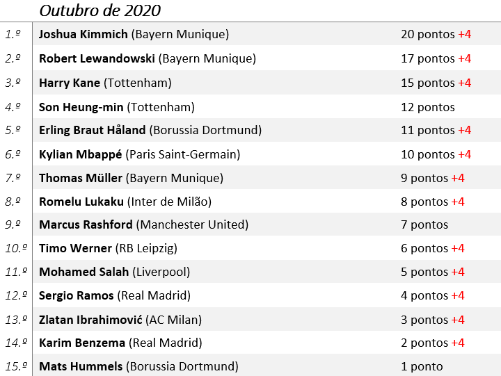 2.º Robert Lewandowski (Bayern Munique) – Marcou 11 golos em 7 jogos durante o mês, incluindo um poker ao Hertha de Berlim. Na Liga dos Campeões ainda está em branco.