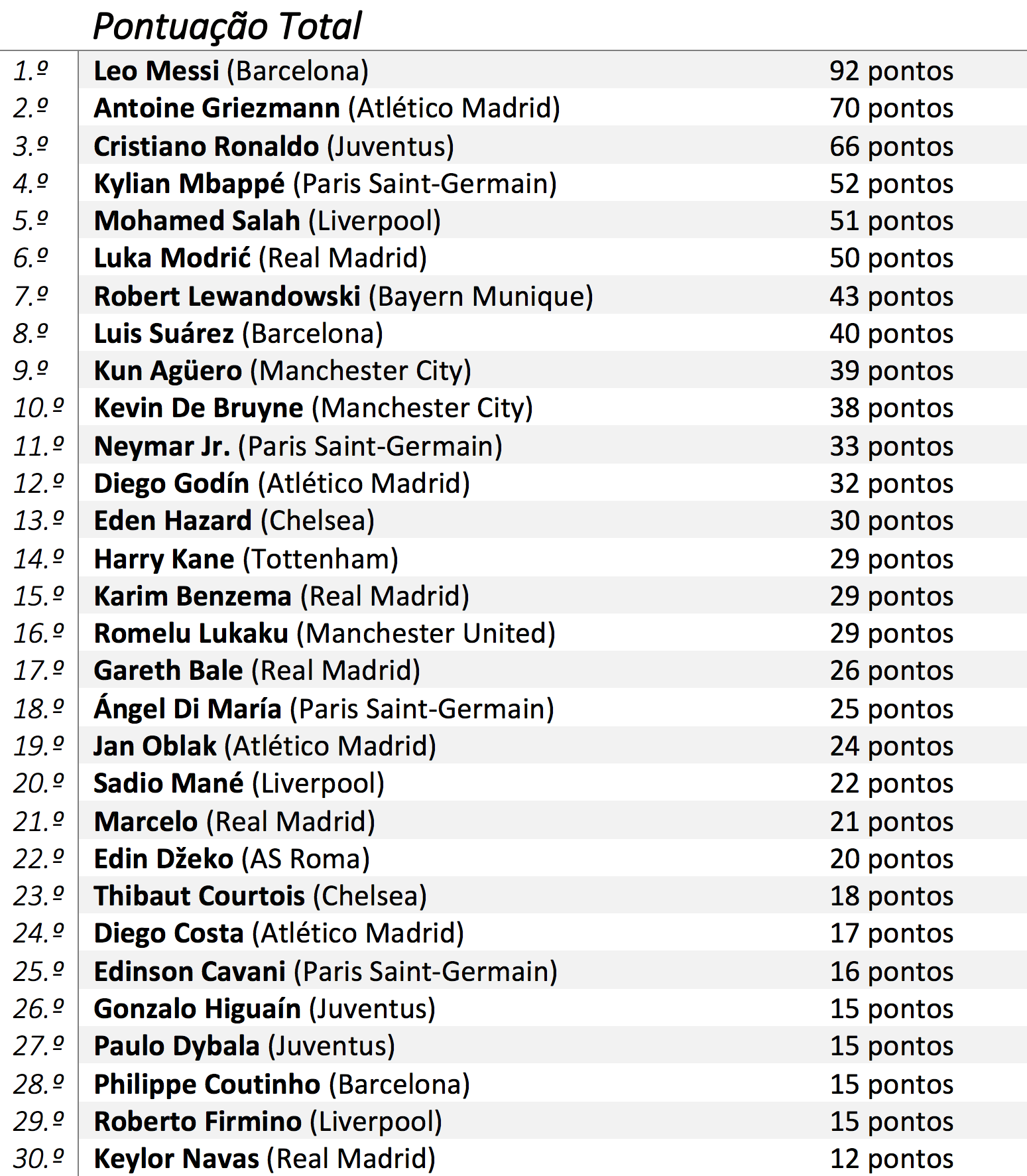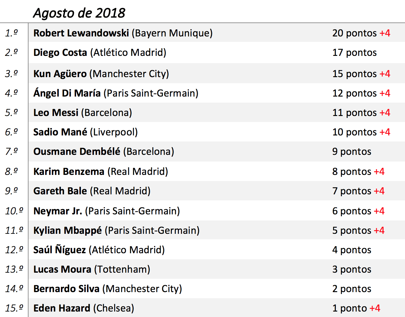 Desde que Ronaldo e Messi se erigiram como os melhores da sua geração, dividindo entre si a maioria dos galardões individuais, a “rivalidade” entre ambos transfigurou a forma como futebolistas, adeptos e o universo do futebol em geral encaram a Bola de Ouro. Nesse sentido, o Visão de Mercado irá mensalmente indicar num ranking aqueles que mais fizeram para conseguir o prémio de melhor jogador do Mundo de 2018 com critérios bem ponderados, ilustrando uma espécie de corrida entre as várias estrelas do futebol mundial. A ideia passa por atribuir uma pontuação aos jogadores que mais se destacaram nesse mês para que no final deste ano civil seja possível, de uma maneira justa, eleger aqueles que foram verdadeiramente os melhores. E como estamos em constante evolução e queremos oferecer aos leitores um método de avaliação cada vez mais justo, este ano, cada vez que um jogador repita a presença no Top, ser-lhe-á adicionado mais 4 pontos.