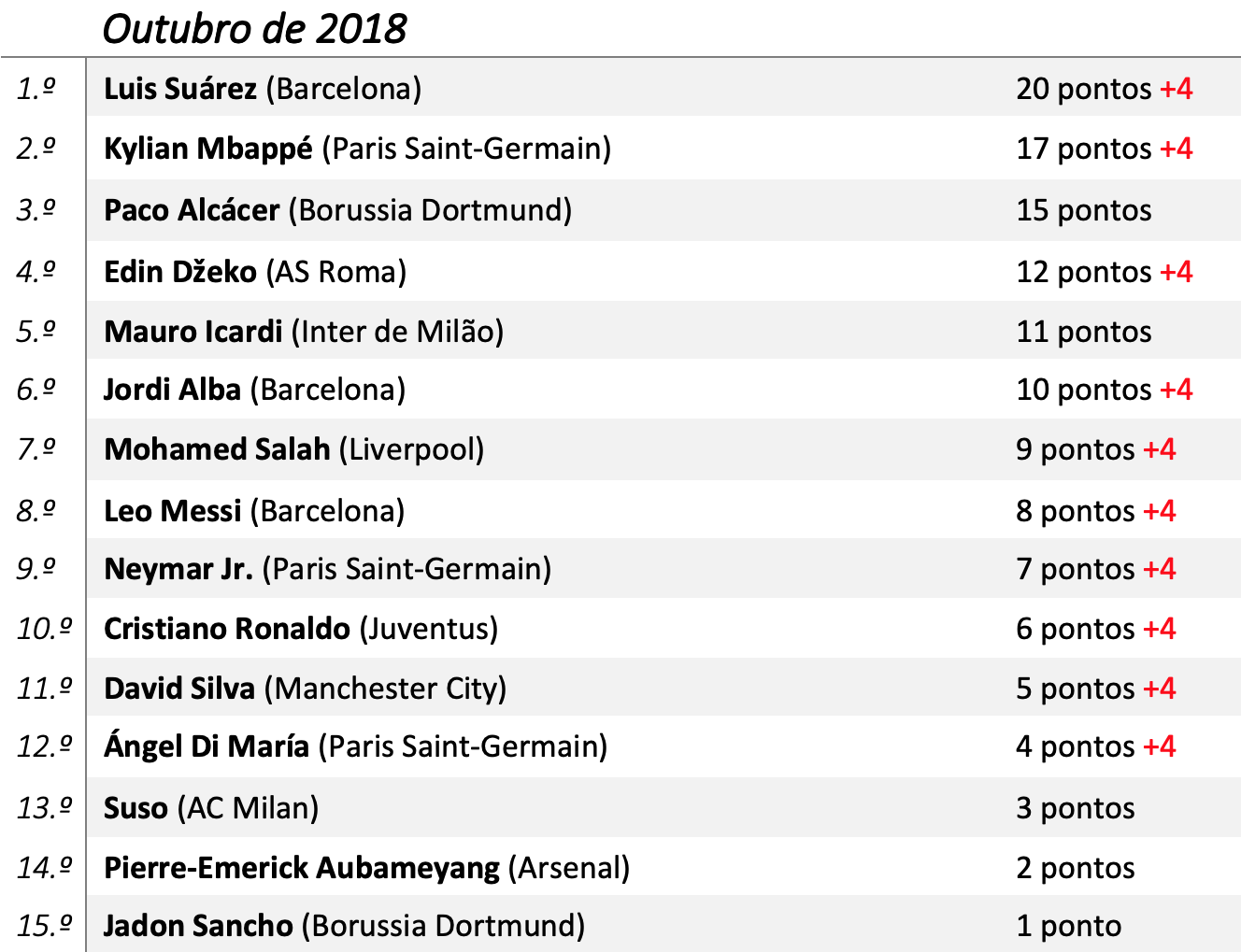 9.º Neymar Jr. (Paris Saint-Germain) – Quatro golos e duas assistências pelo PSG, e mais um passe para golo pela Canarinha. Tem sido ainda o principal desequilibrados do conjunto francês.