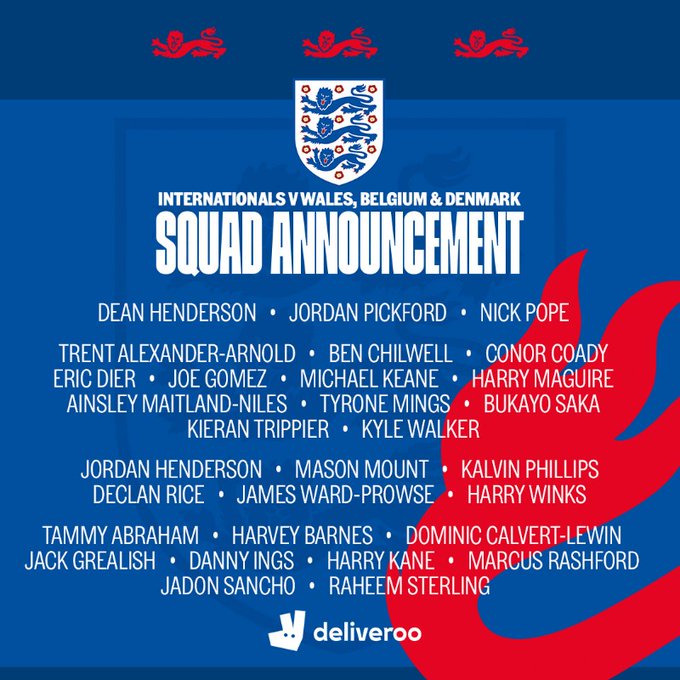 Bukayo Saka (Arsenal), Dominic Calvert-Lewin (Everton) e Harvey Barnes (Leicester) foram chamados pela primeira vez para a selecção principal de Inglaterra. Já Phil Foden e Mason Greenwood, que receberam raparigas no último estágio da selecão inglesa, ficaram fora da lista de Southgate para os jogos com o País de Gales, Bélgica e Dinamarca.
