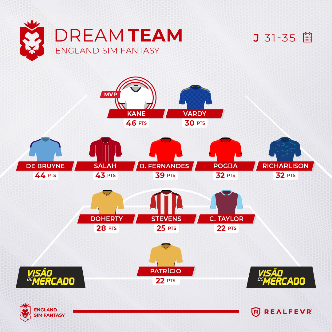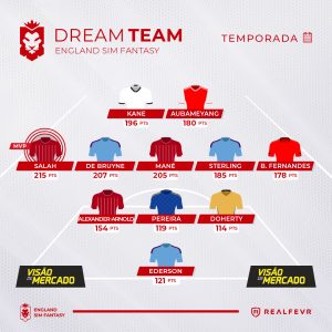 Dream Team do England Sim Fantasy: Ederson (Man City), Ricardo Pereira (Leicester), Doherty (Wolves), Alexander-Arnold (Liverpool), Bruno Fernandes (Man Utd), Mané (Liverpool), Sterling (Man City), Kevin de Bruyne (Man City), Salah (Liverpool), Kane (Tottenham) e Aubameyang (Arsenal).