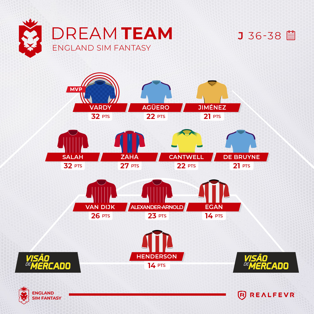 Terminou o England Sim Fantasy, a primeira Liga de fantasy simulada do RealFevr. O Liverpool sagrou-se campeão, tendo aproveitado o empate do City em Old Trafford para celebrar o título na penúltima jornada. A nível individual Salah foi o MVP, com uns incríveis 247 pontos de Fantasy. O craque dos Reds ficou à frente de Kevin de Bruyne (228 pontos) e Sadio Mané (226 pontos). Destaque ainda para o português Ricardo Pereira que integrou o Dream Team final. Já Bruno Fernandes fez parte do 11 durante algumas jornadas, mas na última semana foi superado por Vardy.