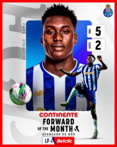 Justo? Samu foi eleito o melhor avançado do mês de Dezenbro da Liga Portugal Betclic. O avançado do FC Porto apontou 5 golos e 2 assistências nesse período, ultrapassando a concorrência de Viktor Gyökeres, do Sporting, e Clayton, do Rio Ave. Author: VM-Desporto