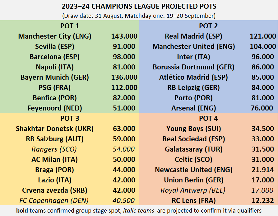 Benica – Num pote 2 fortíssimo onde cairá sempre um adversário de grande valia, os “menos maus” ainda seriam o Borussia Dortmund e o Atlético. No pote 3 claramente evitar o Milan, em relação a todos os outros o Benfica é superior, sendo que a Lazio será sempre mais complicada que os restantes. No pote 4, que para mim, tirando os italianos, é mais forte que o 3, claramente a fava é o Newcastle, seguido de Real Sociedad e Galatasaray. O Lens (que perdeu Fofana e Openda) tem sempre um ambiente frenético no Bollaert. O Union vem em crescendo, portanto os mais acessíveis são Celtic, Young Boys e Antuérpia/AEK.